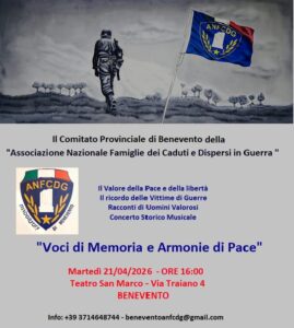 Promossa dal COMITATO PROVINCIALE ANFCDG DI BENEVENTO la manifestazione commemorativa e culturale dal titolo “Voci di Memoria e Armonie di Pace” che si terrà Martedì 21 aprile 2026, alle ore 16:00 presso il Teatro San Marco, Via Traiano 4 – Benevento